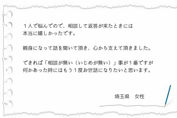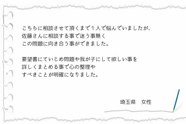 とはいえ、話をうまく進める為、イジメを早く収束させる為自分の気持ちの不安もあり同じ体験をされた 佐藤様を頼ってフォームにご相談させていただきました。
